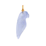 Hand-cut, this blue chalcedony Parakeet pendant is worn around the neck on a chain.