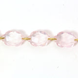 Forming a row of stones, rose quartz are carved, pierced and connected by fine gold rings.